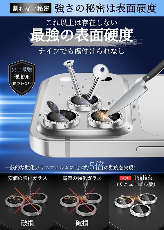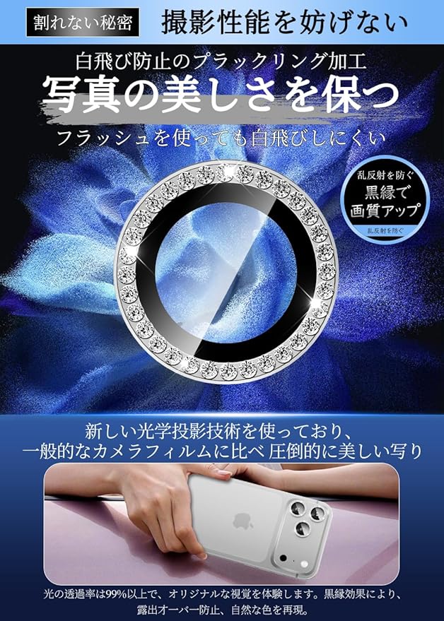 【高級感あふれる美的デザイン】シンプルなフレームデザイン、キラキラダイヤモンド加工が、元の美しさを損なうことなく、本来の艶と高級感を復元し、レンズ本体と見分けがつかないほどの一体感を実現します。1:1の精密加工が生み出す仕上がりは、見た目だけでなく、指先で触れた瞬間にも違和感ゼロ。「貼っていることを忘れる美しさ」が、毎日の使用に自然に溶け込み、特に自撮りやミラー越しの写真では、その仕上がりが真価を発揮します。iPhone 17 Pro/17 Pro Maxスマートフォンのデザインを損なわず、スタイリッシュで高級感のある外観を実現。シンプルなスマホケースとも相性抜群、おしゃれな女性に特に人気。