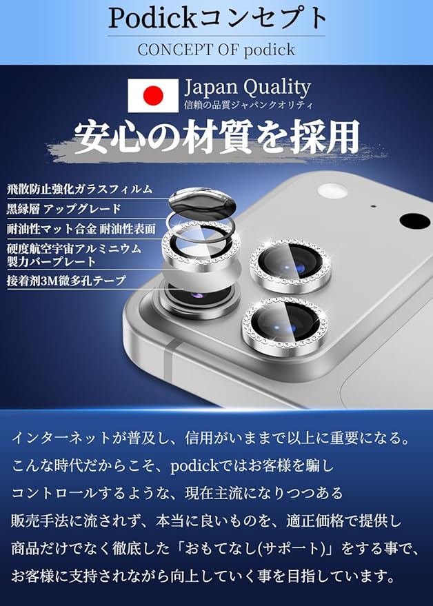 【スマホケースに干渉しません&一体感】Podickカメラ保護フィルムは、レンズ部分だけを包み込む独立設計。iPhone 17 Pro/17 Pro Max本来の放熱を尊重する設計。快適さが続く、毎日の使用に。これにより、ケースと干渉せず、好きなデザインを自由に選べるという自由さを提供。iPhone 17 Pro/17 Pro Maxのレンズ形状に合わせた1:1精密加工で、まるで一体化したかのような美しい仕上がりに。さらに、特殊粘着剤が、気泡なしでしっかり密着。どんな角度から見ても美しく、あなたの個性を引き立たせる。