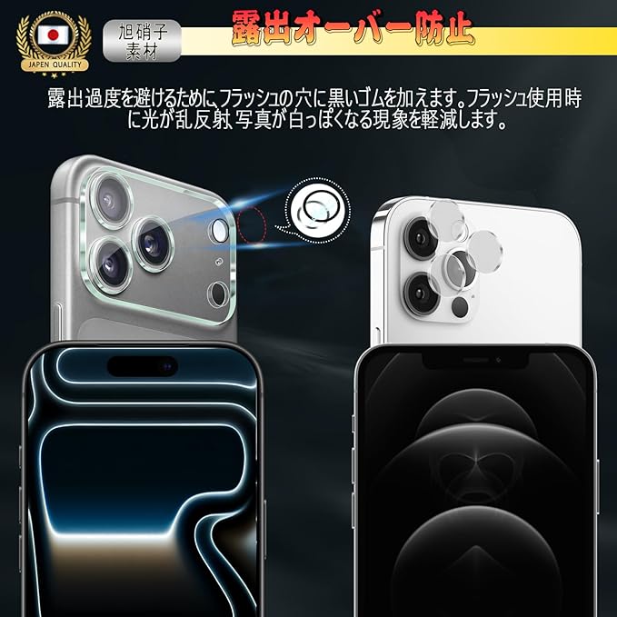 【露出オーバー防止機能!カメラを保護】3眼のレンズ部分だけではなく、四角い台座部分もカバーする剥がれにくいレンズカバーです。広い面を覆うためカバーの密着度合いが高く、レンズのみのカバーと比較して防塵効果が高く、ホコリが入りにくい構造です。カバーにはレンズがぴったり収まる丸い窪みがあり、完全にフラットになります。露出過度を避けるために、フラッシュの穴に黒いゴムを加えます。フラッシュ使用時に光が乱反射、写真が白っぽくなる現象を軽減します。マイク用穴があれば、通話の音質も影響なく良好なままです。※ご注意:本製品は露出オーバーを完全に防ぐものではありません。