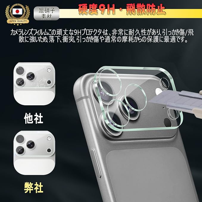 対応 iPhone 17 Pro Max カメラカバー iPhone 17 Pro Max 用 レンズフィルム (2枚) 旭硝子素材製 硬度9H 高透過率 3眼レンズ保護 露出オーバー 貼り付け簡単 キズ防止 飛散防止 防塵 対応 アイフォン17ProMax カメラ保護フィルム