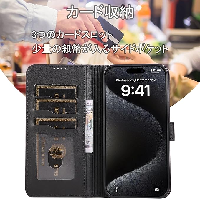 【カード収納】このケースは収納機能を備え、名刺、クレジットカード、交通カード用の3つのカードスロットを搭載。透明ポケットには大切な写真を収納でき、内蔵の小ポケットで小銭も整理可能。この財布型スマホケースは、ちょっとした買い物や散歩に、が気軽に出かけられます。