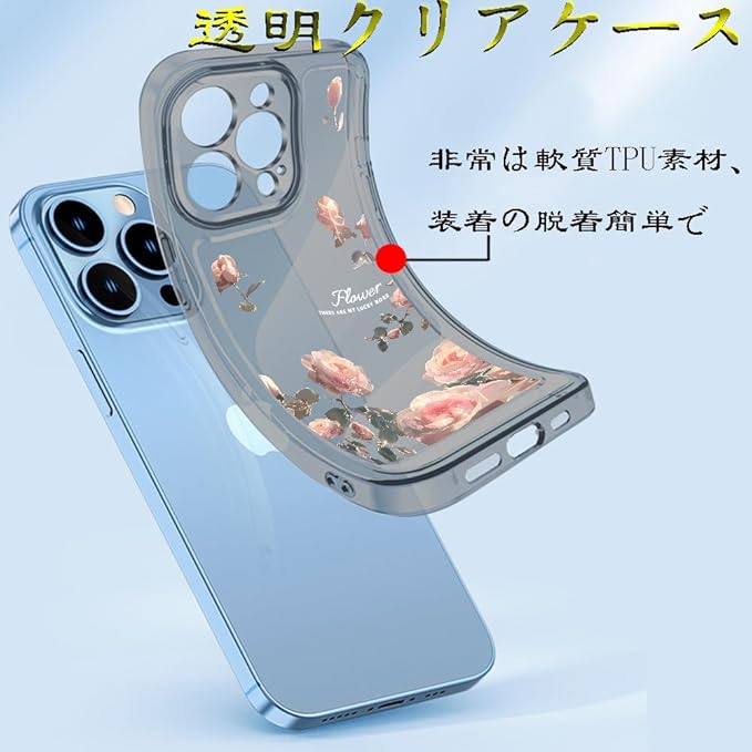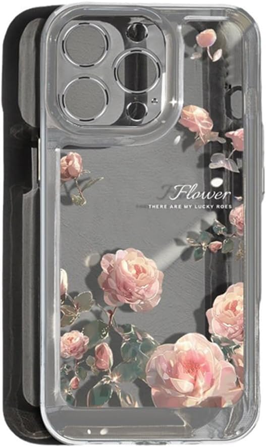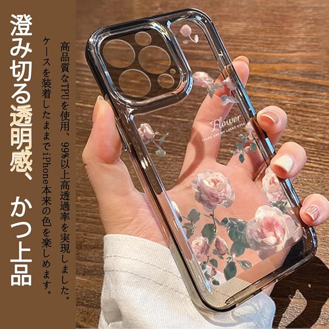 iPhone 17 Pro Max 用 ケース クリア 可愛い バラ本 花柄 TPUソフトケース 透明 かわいい 韓国 薄くて軽い 女の子 女性人気 おしゃれ 耐衝撃 携帯カバー スマホケース (iPhone 17 Pro Max用,ブラック)