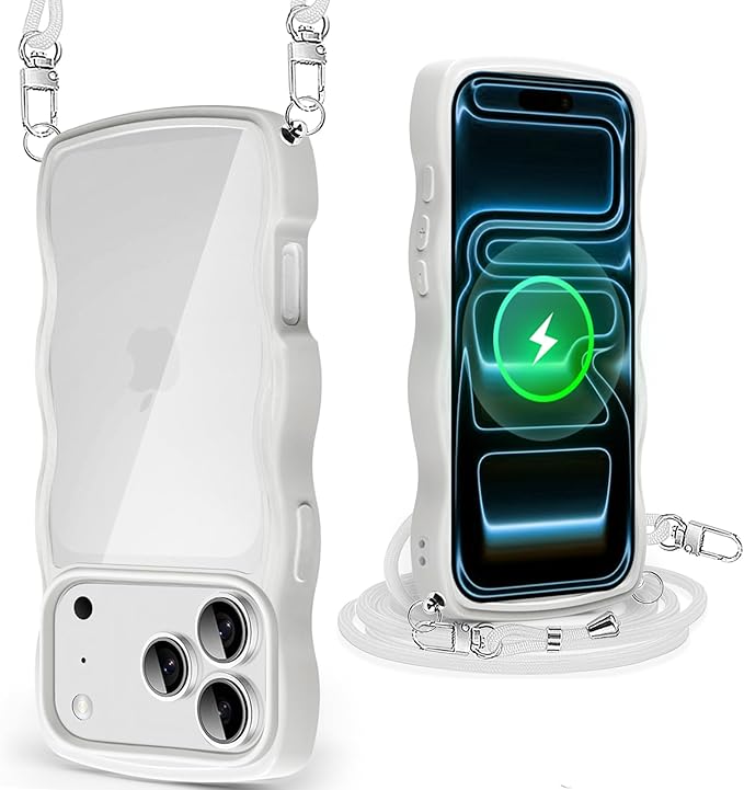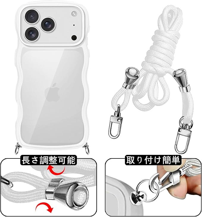 iPhone 17 Pro Max 用 ケース クリア ショルダー アイフォン 17 Pro Max 用 カバー うねうね 透明 人気 かわいい 耐衝撃 スマホケース ストラップ付き 取り外し可能 長さ調整可能 首かけ 肩掛け 薄型 軽量 TPU ワイヤレス充電対応(ホワイト)