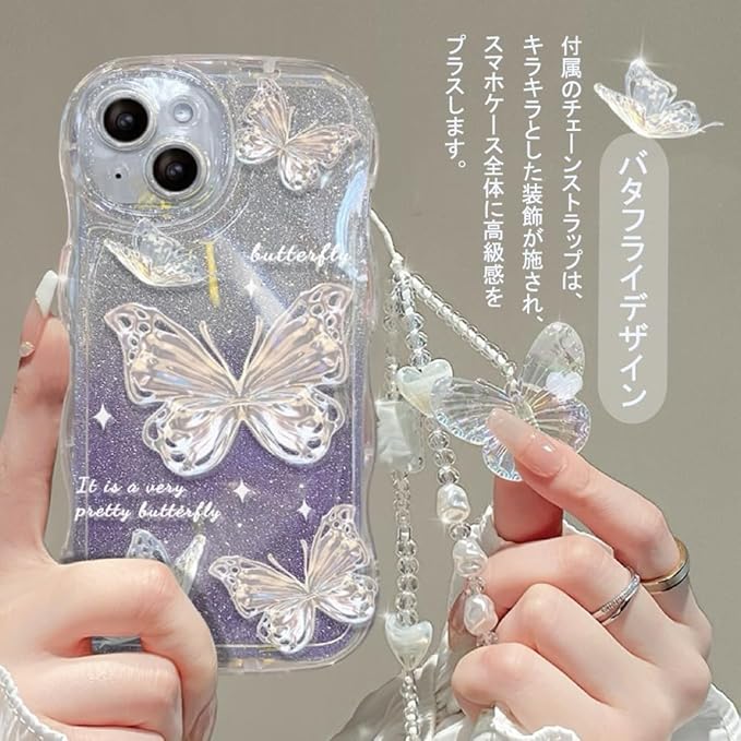 2.ケース全体に施された立体的な蝶々のデザインは、光の反射でキラキラと輝き、スマホを華やかで洗練された印象に仕上げます。繊細でリアルなバタフライモチーフは、持つ人に高級感を与えつつ、個性をアピールできます
