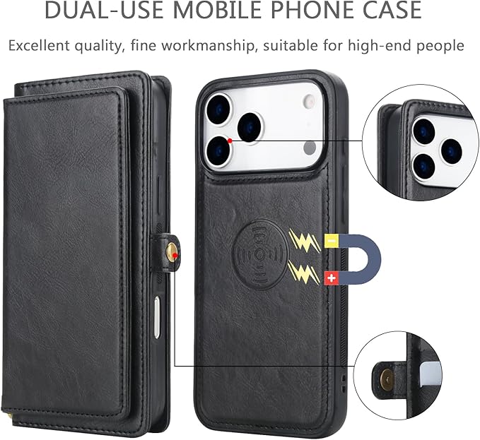 Pelanty for iPhone 17 Pro Max ケース手帳型 for iPhone17pro max 2in1背面カバー PUレザー+TPU 分離式 両用2way 取り外し自由 携帯カバー 財布型ICカード収納 お札入れ小銭入れ スタンド機能 マグネット 縄掛けストラップ付き アイフォン17プロ Max 耐衝撃 滑り防止(ブラック)