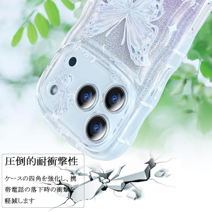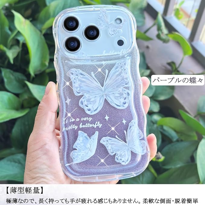 スマホケース 対応 iPhone 17 Pro Max ケース クリア 透明 キラキラ 蝶々 波型 かわいい tpu ソフト 薄型 軽量 女性人気 キャラクター 衝撃吸収 指紋防止 ストラップホール付き 対応 アイフォン17プロマックス 携帯ケース (パープル&蝶)