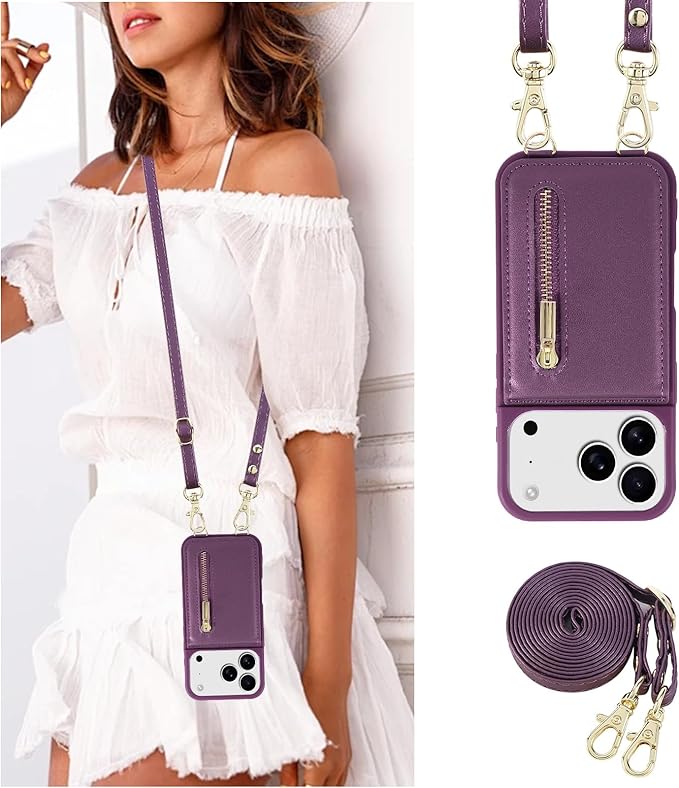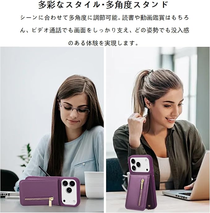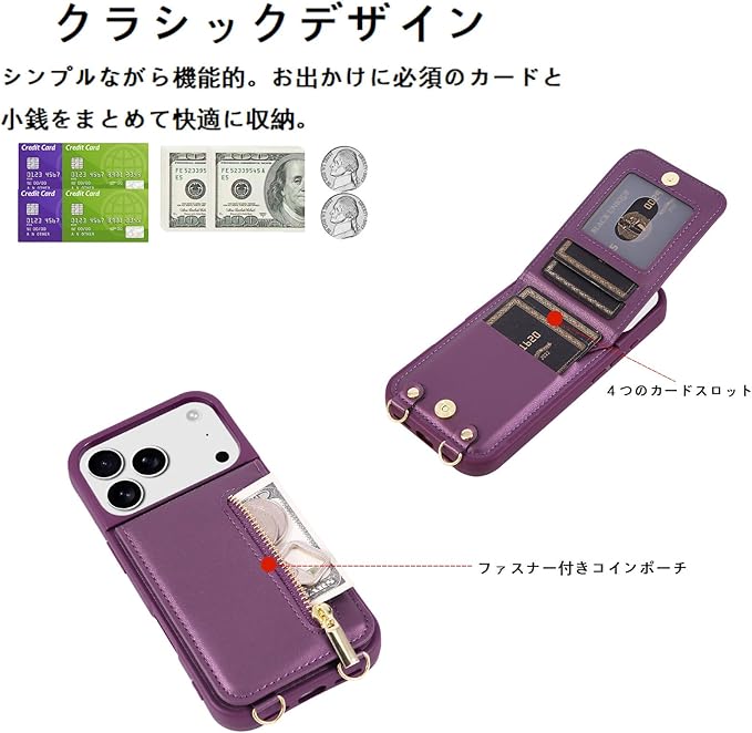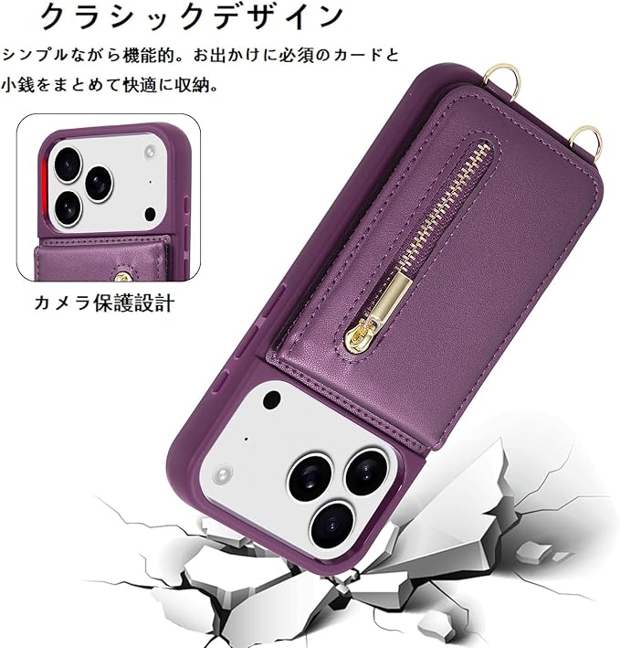 Jcxtrombulous対応 iPhone 17 Pro Max ケース 背面カード マグネットICカード収納 調節可能なストラップ付き 耐衝撃な 携帯ケース アイホン17 プロマックス スマホ PUレザー スタンド RFIDブロッキング技術ケース 6.9inchパープル