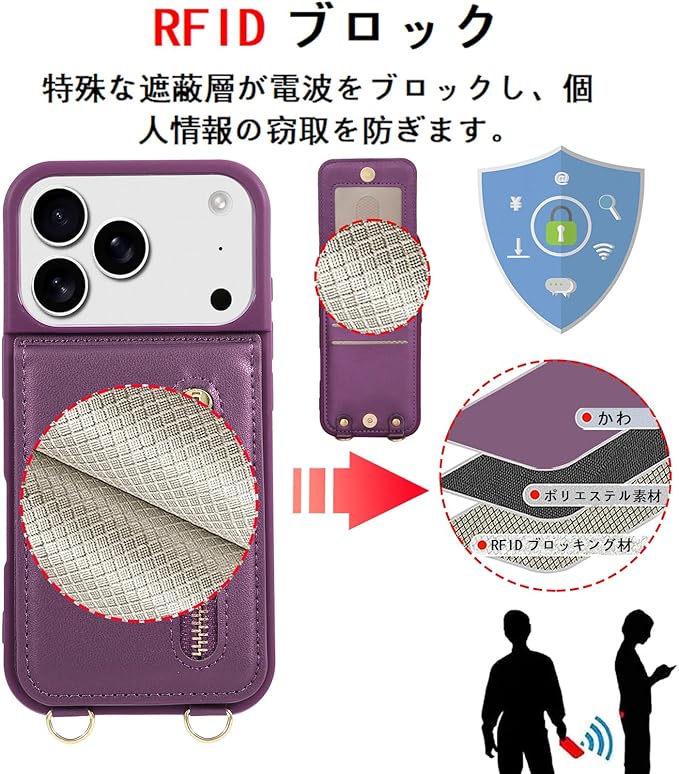 【RFIDブロッキング技術採用】本iPhone 17 Pro Maxケースはカードスロット&ポケットの裏地につける布はRFIDブロッキングライニングを採用しています。先進的なRFIDセキュア技術を利用して、信号をブロックして、ICカードの情報や個人情報などを安全に守ります。信号がブロックするから、カードをケースに入れたまま反応しない場合は、カードを取り出してご利用ください。