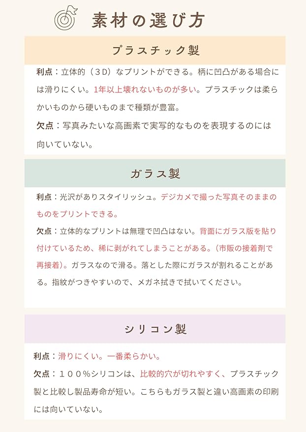 欠点:立体的なプリントは無理で凹凸はない。背面にガラス版を貼り付けているため、稀に剥がれてしまうことがある。(市販の接着剤で再接着)。ガラスなので滑る。他の素材と比較し、指紋がつきやすい。その場合、メガネ拭きで拭いてください。