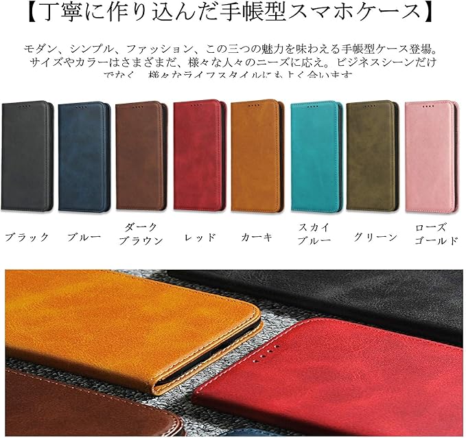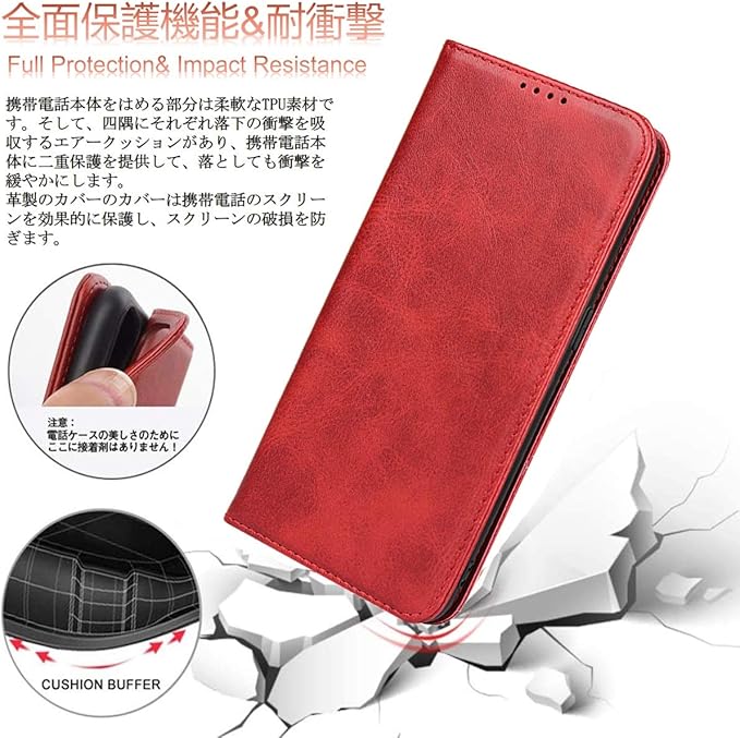 上質な素材:外部は上質な合皮レザー素材を採用しており、放熱性が良く、傷や埃を防ぐことができます、滑りにくく、指紋、油分などもつきにくく。インナーケースは弾力性の柔軟黒TPU素材を採用しており、角までしっかり保護できるケースです、柔軟性があり本体への装着脱着も簡単です。衝撃吸収機能あり、しっかりの二重保護でお携帯を守り抜きます