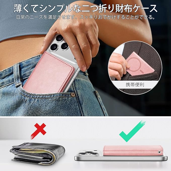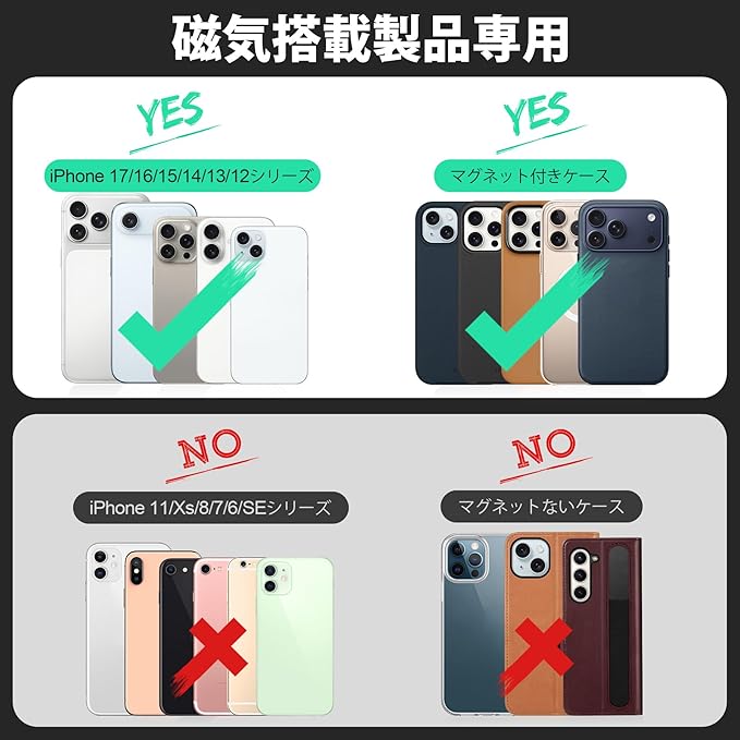 【幅広い互換性】このスマホカードケースはiPhone17/iPhone Air/17 Pro/17 Pro Max/iPhone16/16 Plus/16 Pro/16 Pro Max/iPhone15/15 Plus/15 Pro/15 Pro Max/iPhone 14/14 Plus/14 Pro/14 Pro Max/iPhone13/13 Pro/13 Pro Max/iPhone12/12 Pro/iPhone 12 Pro Maxに対応します。ご注意:本商品はただ磁力吸着機能搭載のスマホやスマホケースだけに対応できます、(iPhone11/11Pro/11 Pro Max/7/8/SE2/SE3/XS Max/Xs/XRに対応しません)。ご購入前に、対応機種をしっかりとチェックしてください。