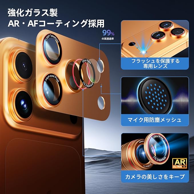 iphone 17 pro max 用 カメラ保護 フィルム アルミ合金製 強化ガラス 全面保護 2枚セット いphone17pro max レンズカバー アルミ合金 9H強化ガラス 露出オーバー防止 耐衝撃 高透過率 かっこいい オレンジ