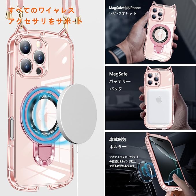iPhone 17 Pro Max クリア ケース 可愛らしくシンプル 猫耳にストラップ穴付き Magsafe 対応 ワイヤレス充電対応 iPhone17 promax ケース 薄型 軽量 ストラップ 長さ調節可能 車載対応 120 回転スタンド 縦横視聴対応 フル保護 黄変防止 落下防止 両手を解放