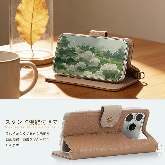 【対応機種】iPhone17ProMaxの手帳型スマホケース。機種やカラーの選択には間違いがないようにご購入お願い申し上げます。専用カメラ穴が開いており、本製品を装着したまま、カメラでの撮影が可能です。この手帳型ケースの取り付け/取り外しが簡単で貴重な携帯本体全面保護でき、落下などの損傷の心配ありません。