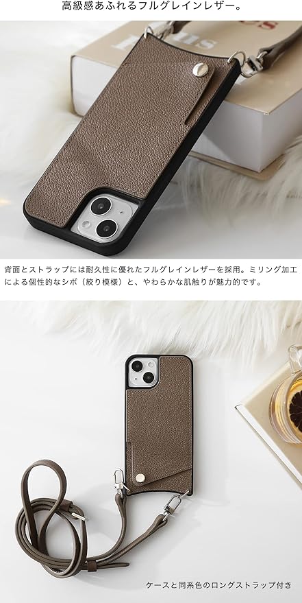 【素材】背面とストラップには耐久性に優れたフルグレインレザーを採用。ミリング加工による個性的なシボ(絞り模様)と、やわらかな肌触りが魅力的です。ケース本体はシリコン(ブラック)です。※仕入れる生産ロットや裁断箇所により、色合いや模様の出方が若干変わる場合がございます。「イメージと違う」など初期不良以外での返品・交換はご遠慮いただいております。予めご了承ください。