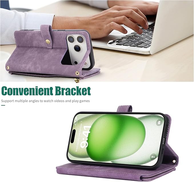 BonwFzin For IPhone 17 Pro MAX ケース 手帳型 ショルダー 適用 【 ストラップ 二本同梱】 アイフォン17プロマックス ショルダーケース IPhone17ProMAX 手帳 スマホケース ストラップホール付き バッグ マグネット 肩がけ 斜め掛け ファスナー ジッパー スタンド カード入れ レトロ パープル