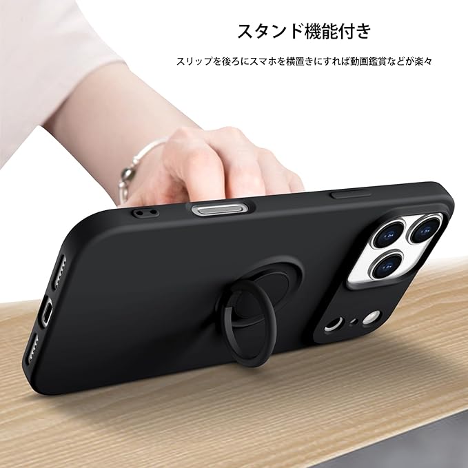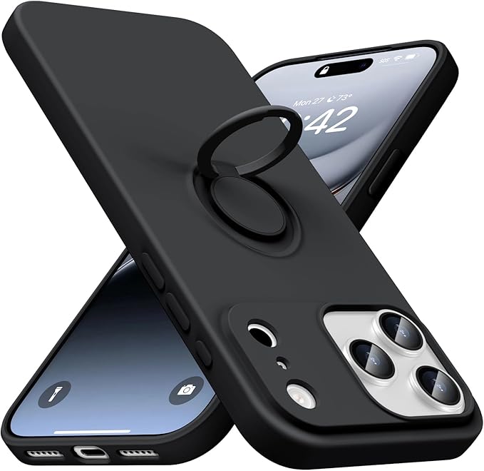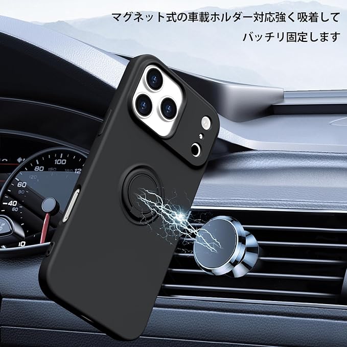 iPhone 17 Pro Max 対応 ケース TPU 耐衝撃 リング シリコンケース 薄型 ソフト 全面保護カバー 指紋防止 リング付き スタンド機能 車載ホルダー対応 360 回転 レンズ保護 ストラップホール付き スリム 軽量 黄変防止 防塵 アイフォン 17プロ マックス対応カバー [黒] KC6-410