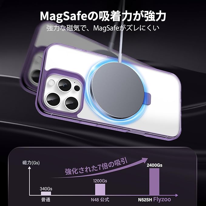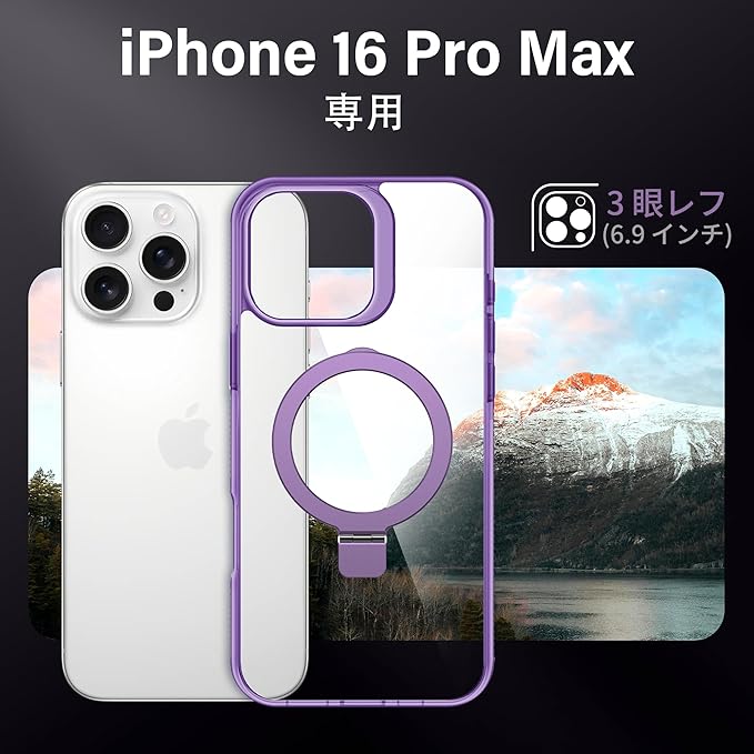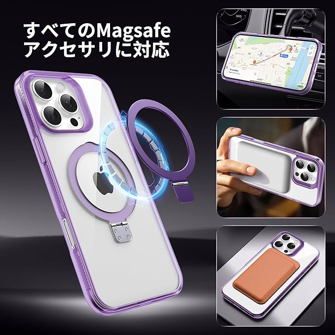 【隠しスタンド リング・MagSafe対応】Flyzooケース用のiPhone 16 Pro Max [ワイヤレス充電対応 多機能一体] クリアで透明な 黄ばみ防止 米軍MIL規格 耐衝撃 高耐久性 傷つけ防止 滑り止めグリップ マグネットホルダースマホ保護カバー 6.9インチ(パープル)