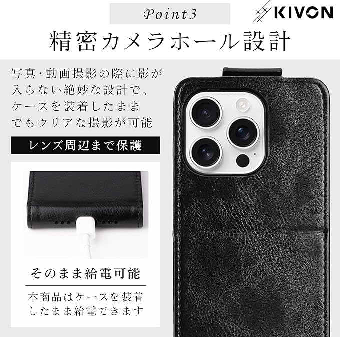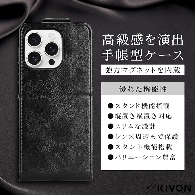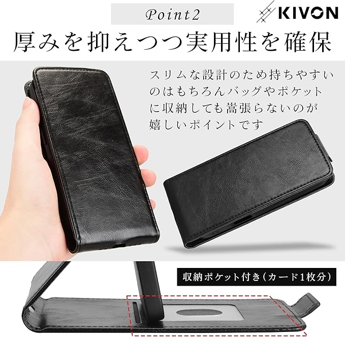 【縦開き&自立式】スタンド機能を備えた縦開き構造で、ビデオ通話やリモート会議中もスマートに使えます。机の上に自立するため、両手が空いて作業効率もアップ。 【ビジネスに映える高級感】上質なPUレザーを使用し、落ち着いたカラーバリエーションでビジネスシーンにも最適。カバンやスーツとの相性も◎ 【カードポケット付き】内側にはカードを1枚収納できるスリムなポケットを搭載。ICカードや名刺など、必要最低限の携帯に便利です。 【薄型&精密設計】本体にしっかりフィットする専用設計で、カメラやボタン周りも快適に操作可能。ケースを装着したまま充電もOK。 【KIVONブランド品質】機能性とデザイン性を両立したスマホケース。 ※環境に配慮した簡易包装のため、パッケージに若干のシワが見られる場合がございます。品質には影響ございませんのでご安心ください。