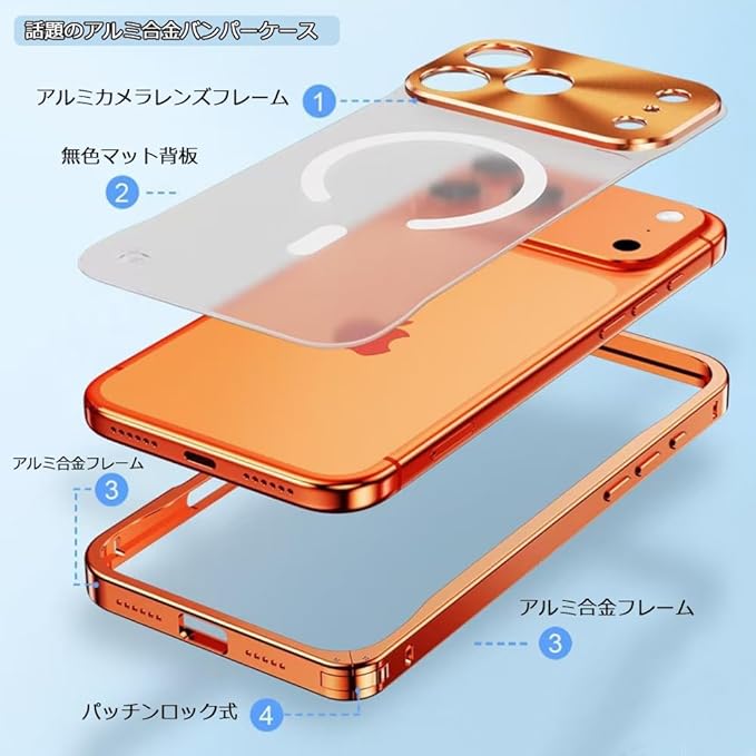 【取り外し簡単なバンパーバックル式】シンプルなスタイルで衝撃吸収から守るケース、側面に耐久性のあるアルミ素材を背面に高硬度の樹脂素材を使用した自動バックル式ケースです。