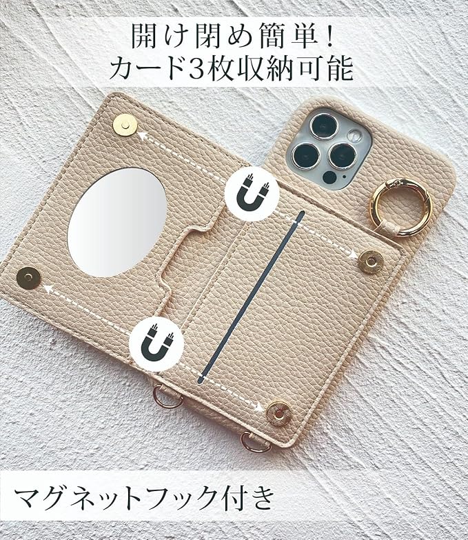 商品特徴◎ケース ショルダー ストラップ付き ◎マグネット止め、開け閉めが便利! ◎3枚カード収納可能。便利な指穴があり、カードの取り出しが簡単。 ◎ケースに鏡付き ◎スタンド機能有り ◎カラビナリング付き、落下防止