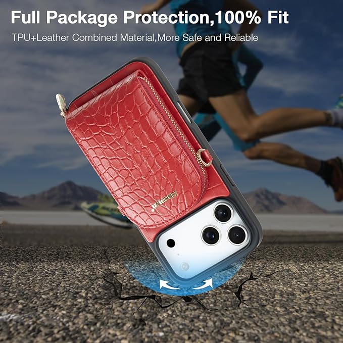 Hanman ブレスレットとショルダーストラップ付きレザーウォレットケース と互換性のあるiPhone 17 Pro Max,RFIDブロッキングPUレザージッパーウォレットケース,4つのキャッシュポケットと2つのカードスロットを備えています-レッド