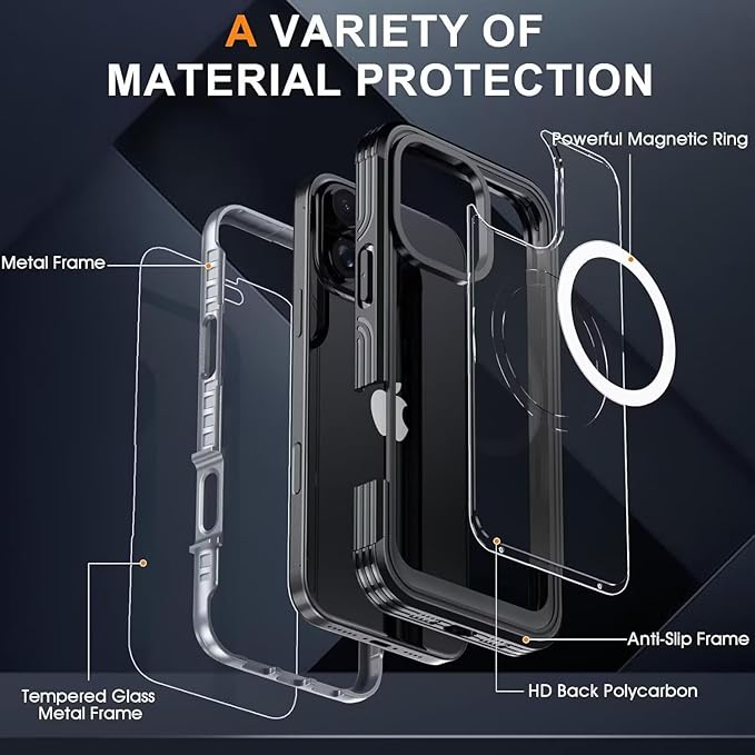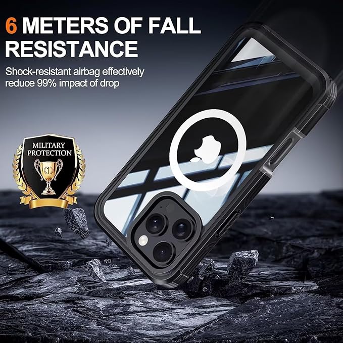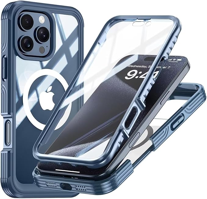 耐衝撃 360度全面保護 米軍用両面カバー iPhone16ProMax ケース Magsafe対応 ガラスフィルム付き アウトドア 両面ケース 頑丈 滑り止め 前後 クリアカバー 防塵 防雪,深ブルー