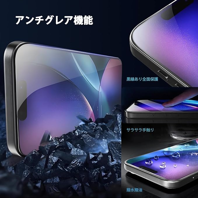 「アンチグレア機能・反射低減」フィルムは反射防止コーティングを加工され、いPhone 17 Pro Maxスクリーンへの太陽光や蛍光灯などの反射や映り込みを抑え、視認性を向上させて画面が見えやすくなり、長時間スマホの画面を見ていても眼が疲れにくいです。
