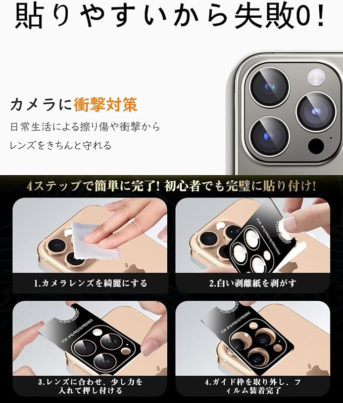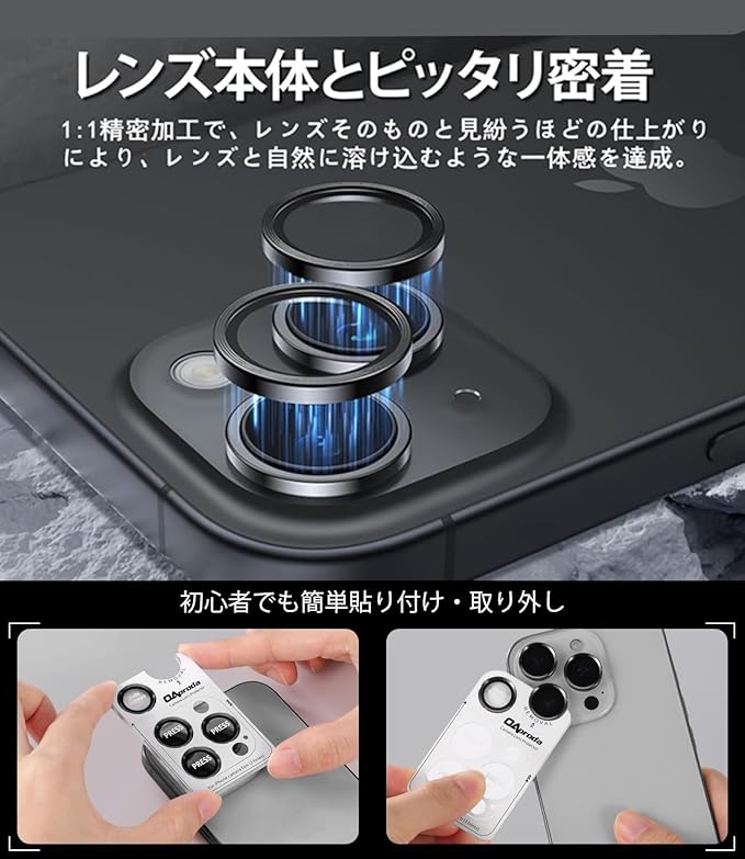 【正確フィット&高密着度】iPhoneのカメラ部分に基づいた1:1の精密設計で、ずれることなく3眼のレンズに正確にフィットします。接着面には超強力接着力、防水性、防汚れ性を備えた高品質3M接着剤を使用しており、様々な環境でも安定した接着効果を維持できます。ホコリや汚れがつきにくいので、長期に安定した保護が提供できます。高い透過性能を持ち、貼って硬化後も跡が残りません。そして、レンズフィルムを剥がした後も跡が残りません。