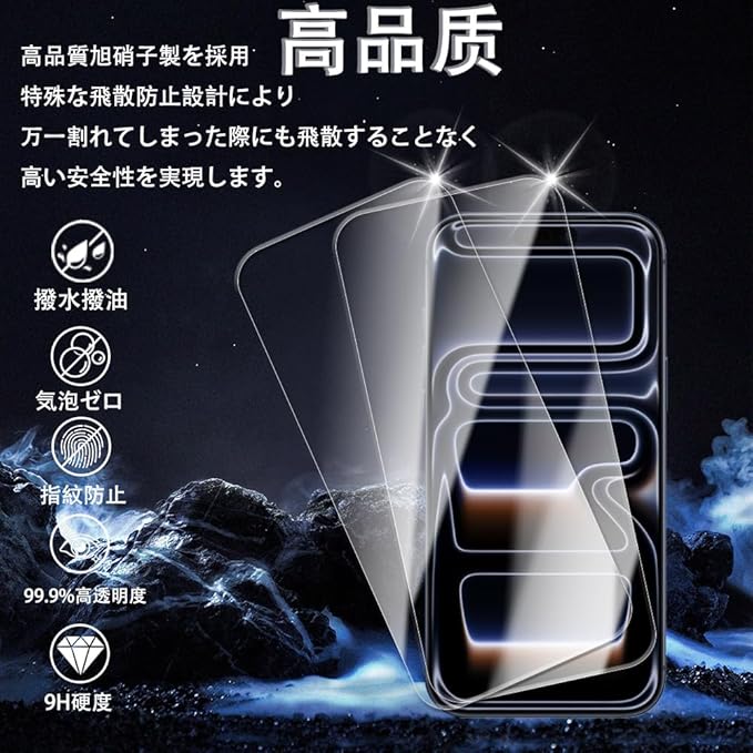 【飛散防止設計】iphone 17 pro max ガラスフィルム 高品質の日本硝子素材を採用します。飛散防止加工により、万が一ガラスが破損した場合も飛び散らず、破片は張り付いたままの状態になります。スクリーンを安 全に保護しながら破損による怪我を防ぎます。とっても安全!