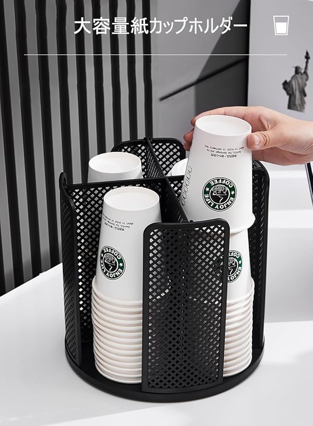 紙コップホルダー カップホルダー 360度回転 カップディスペンサー 紙コップ収納 カップスタンド 大容量 コーヒーカップ コンビニ、ビュッフェ、オフィスなど適用 (ブラック)