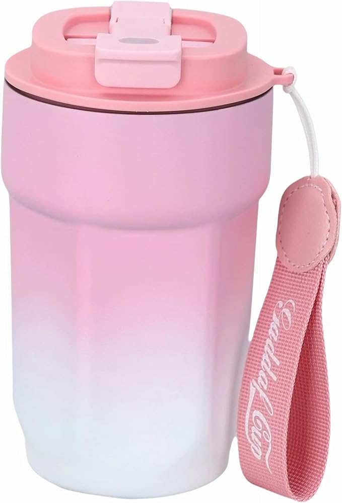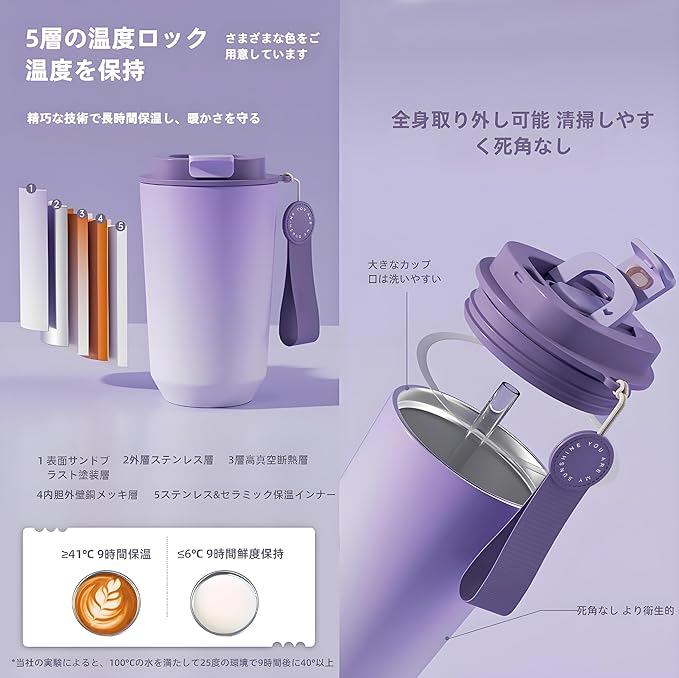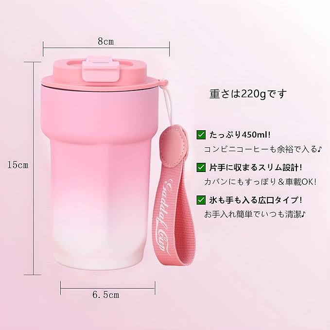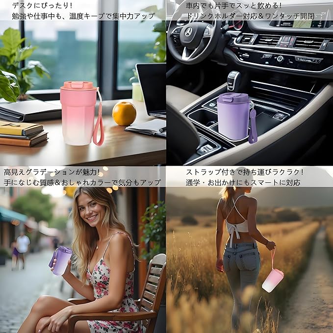 4. 「持ち運び タンブラー」 携帯ストラップ付きなので、登下校や外出時の持ち運びにも便利です。また、ダイニングテーブル、コーヒーテーブル、デスク、オフィスの机の上に置いても、とてもシンプルでエレガントに見えます。片手で持ったり、車のカップホルダーに入れたりすることができ、持ち運びや収納に便利。注:カーラックに載せる際はサイズをご確認ください。