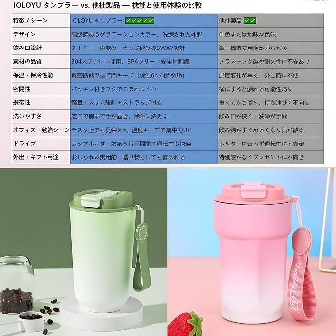 商品名:IOLOYU タンブラー ストロー付き 蓋付き こぼれない ステンレス 水筒 真空断熱 コーヒー タンブラー 3WAY 450ml 大容量 魔法瓶