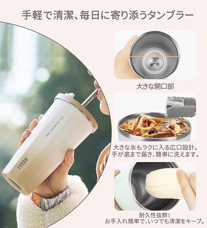 広口デザインで洗浄簡単:広口設計により、このタンブラーは底まで手が届きやすく、内部を簡単に隅々まで洗浄できます。コーヒーやお茶の汚れ、臭いが残らず、いつでも清潔に使用できるタンブラーです。清掃が簡単で、使用後の手間も少なく、毎回新鮮な飲み物を楽しめます。