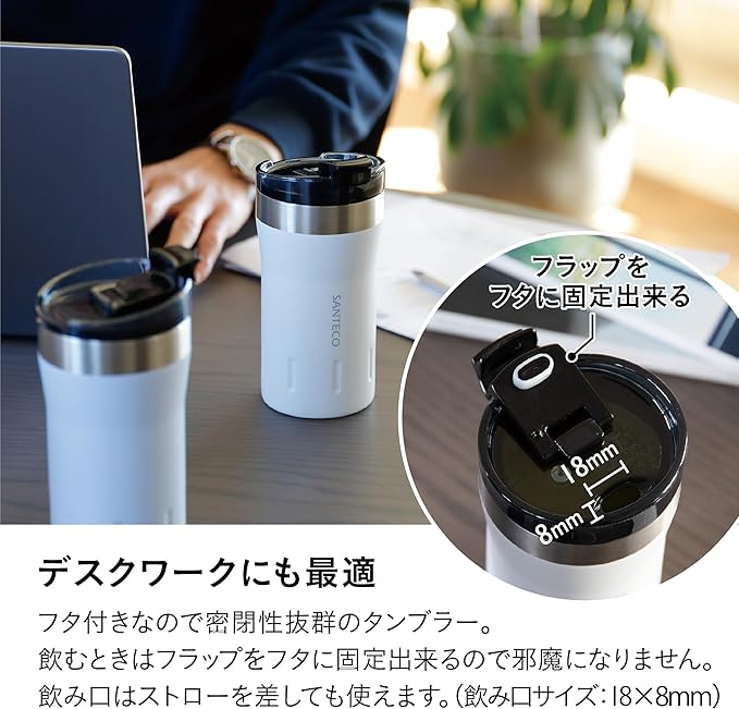 飲み口のフラップはロックされるので、傾けて飲むときもフラップを手でおさえたり気せずに飲むことができます。ストローを入れて飲むこともできるので、ドライブにもオススメ※飲み口サイズは18 8mm