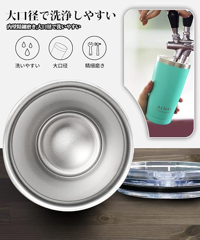 【大口径の設計】手に入れる広口だから、底まで徹底的に洗えます、対応のステンレスタンブラー。ソフトドリングを注いだり、大きな氷も入るワイドタイプです。