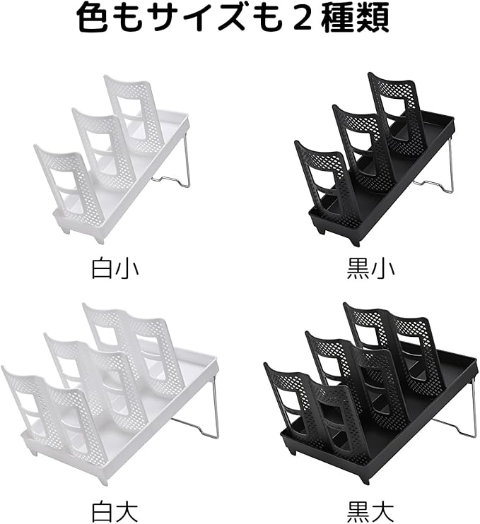 【おしゃれなカップホルダー】実際にお店で使われているカップホルダーなので置くだけでおしゃれにインテリアとしても活躍します。細部までこだわっており、足の部分はステンレス製の脚で高級感を出しました。 【平置きもナナメ置きも◎】安定してキレイに収まる平置きはもちろん、カフェのようなオシャレな雰囲気を演出できるナナメ置きもできるよう設計されました。 【組み立てかんたん】工具は一切不要で、はめ込むだけのかんたんセッティング。誰でも迷うことなく設置できます。 【大容量収納】実際にお店で使用されているので、見た目だけでなく実用的に使用できるよう大容量に設計されており費用対効果もありお得です。 【商品内容】サイズ小:33 11 5(cm)大:33 22 5 材質:ABS、ステンレス 重量:小:300g、大:500g カラー:ホワイト、ブラック