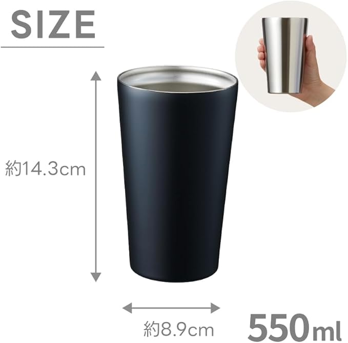人気のサーモタンブラーの550mlタイプです。真空二層構造で保冷保温機能があるため、長時間適温で飲み物を楽しむことができます。500ml缶の容量を注ぐことができ、コンビニなどのラージサイズテイクアウトカップのドリンクホルダーとしてもお使いいただけます。錆びにくく匂いもつきにくいステンレスの素材を使用しており、使い勝手が良いのも魅力の一つです。