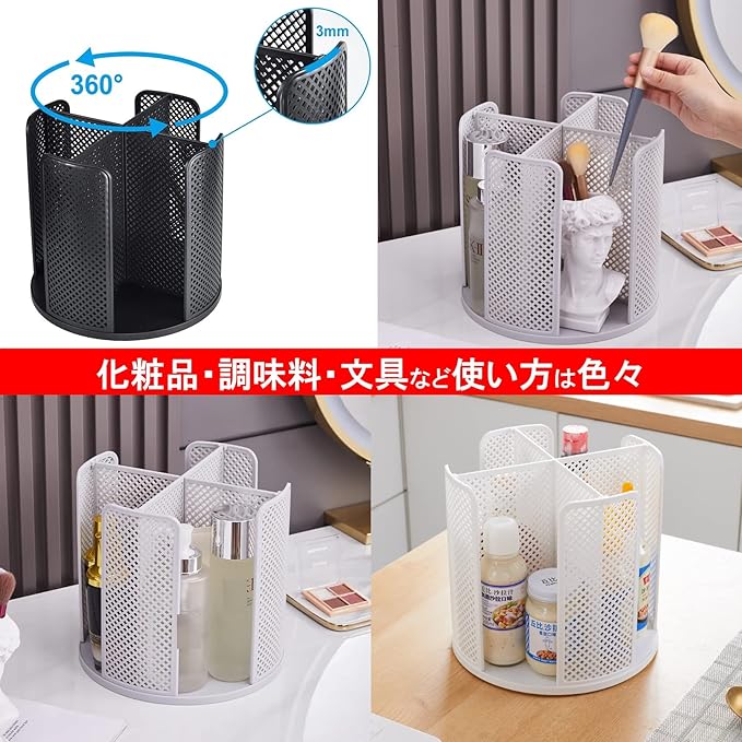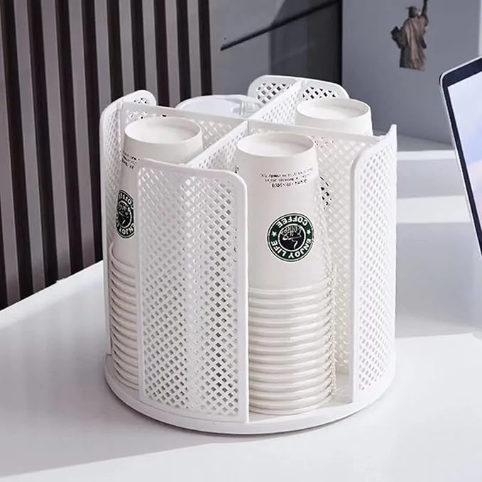 オフィスのドリンクコーナー、カフェやブッフェなどの飲食店、コンビニ、パーティ会場、ご自宅など、あらゆるシチュエーションでご活用いただける紙コップスタンドです。 紙コップ収納の他にも、調味料や化粧品、文具の収納など様々な用途にご利用いただけます。360度回転しますので取りたい物に直ぐアクセスすることができます。又、4つのコンパートメントで物品の整理整頓にもご活用いただけます。