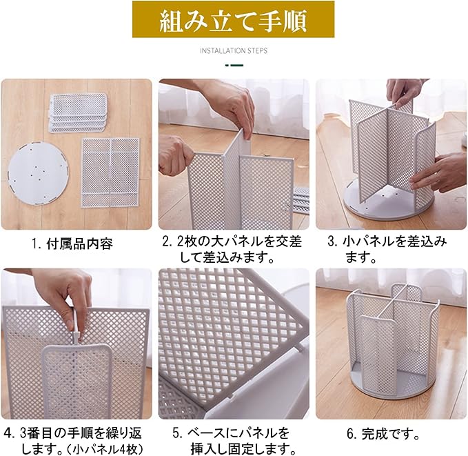 この紙コップホルダーは組み立て式です。組み立て手順です。 ①付属品を準備します。②2枚の大パネルを交差して差込みます。③小パネルを差込みます。④③の手順を繰り返します(小パネル4枚)。⑤ベースにパネルを挿入し固定します。⑥完成です。