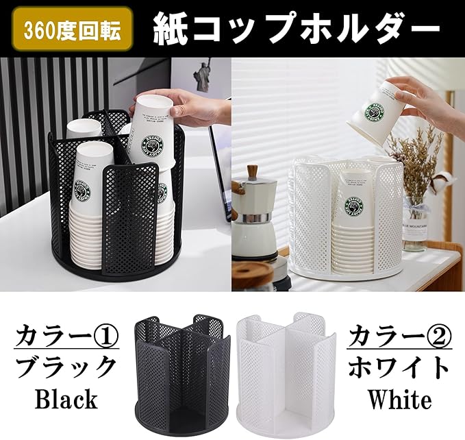360度回転大容量 紙コップホルダーです。カラーはブラック、ホワイトの2種類をご用意致しました。4つのコンパートメントで、紙コップの他にリッド、マドラー、シュガー、ミルクなども設置可能です。360度回転仕様で収納しやすく取りやすい紙コップスタンドです。