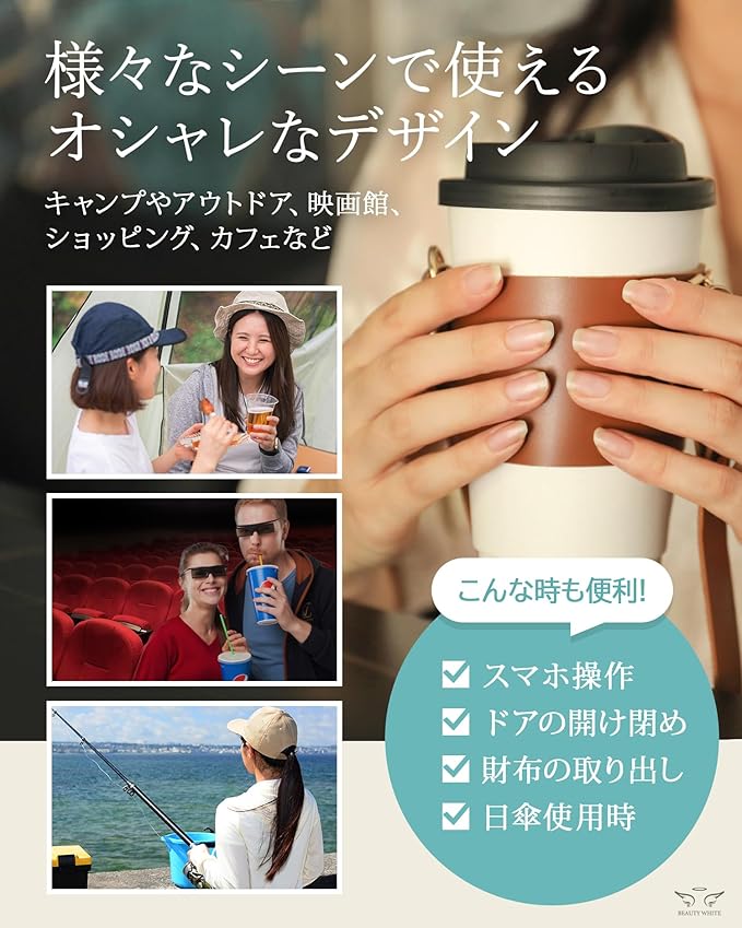 【様々なシーンで便利に使える】 キャンプやアウトドア、釣り、映画、ショッピング、カフェでのイートインにも、カップホルダーがあることでどんなシーンも快適に◎スマホ操作や荷物の出し入れがしやすくなることはもちろん、日傘を差していても片手が空くのでとても便利です。高級感のあるシンプルなデザインは、男女問わずスタイリッシュにお使いいただけます。