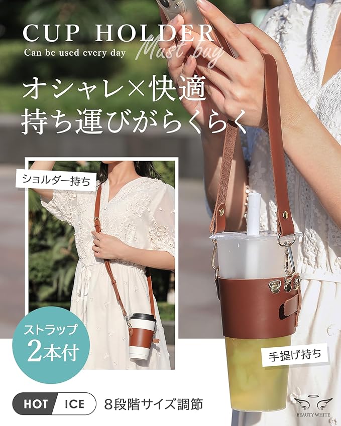 【商品詳細】 〇サイズ:《カップホルダー》飲み口直径6.5cm~9.5cm 調節可能《ロング》長さ118cm~151cm 調節可能、幅1.7cm《ショート》長さ45.5cm、幅1.7cm 〇素材:PUレザー 〇重量:《カップホルダー》31g《長いストラップ》53g《短いストラップ》20g 〇セット内容:カップホルダー、ストラップ(長短2本セット) 〇ブランド:BEAUTY WHITE