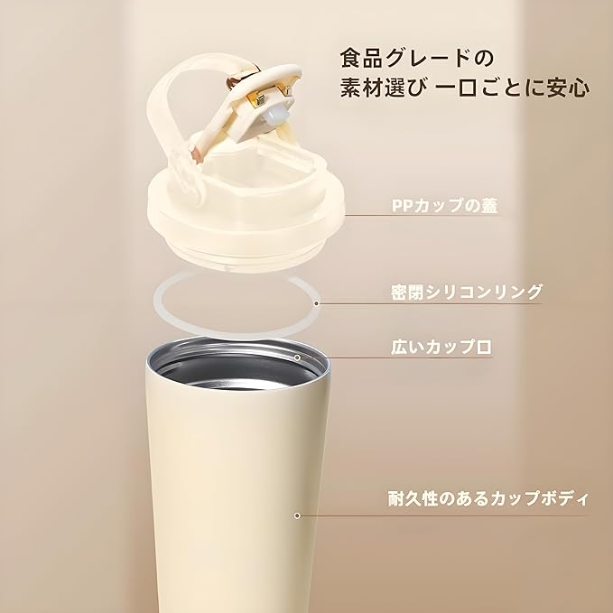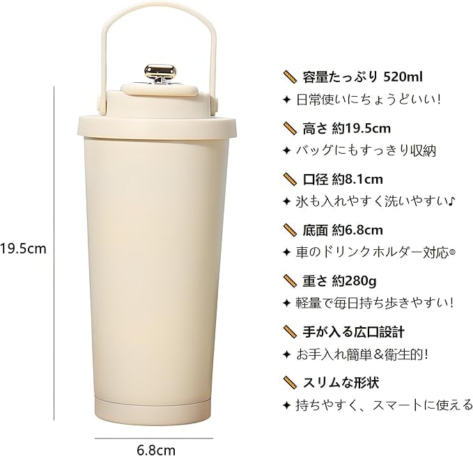 【医療用316ステンレス鋼】IOLOYU タンブラー 蓋付き こぼれない ステンレスタンブラー 520ml 大容量 洗いやすい 水筒 コーヒー 真空断熱タンブラー 持ち運び 持ち手付き 保温杯 手を入れて洗える水筒 密閉 漏れない 車 可愛い コンビニ coffee mug 大きい 保温 保冷 咖啡杯 (2way 飲口 白ベージュ)