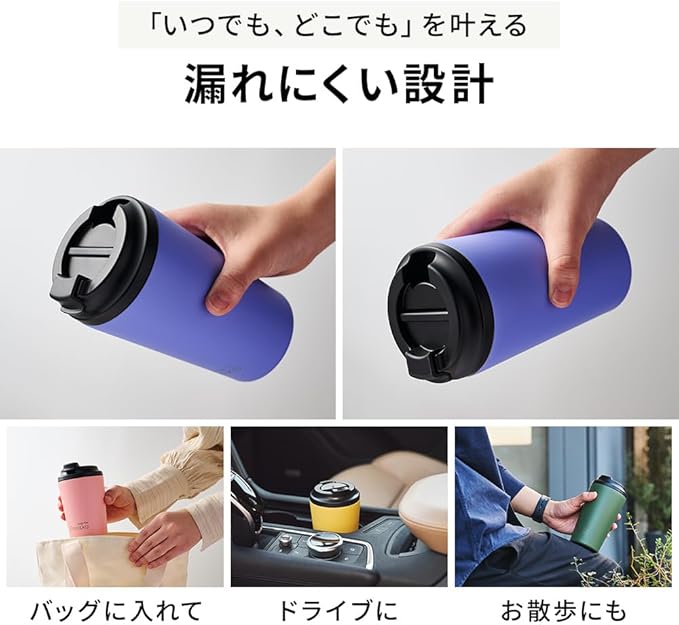 お手入れ簡単、手間いらず、こぼれ防止の真空二層構造ステンレスコーヒーカップ。