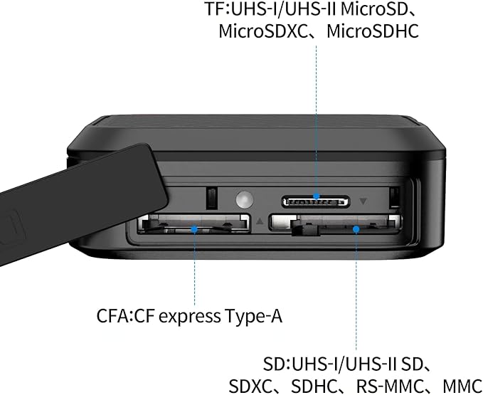 【3枚カードを同時に読み込む】3つの高速データ転送チップが統合されているため、 3 枚のカードを同時に使用できます。※インジケーターCFAカード使用時はインジケータが白く点滅します。SD または TF カードを使用すると、インジケーターライトが緑色に点滅します。