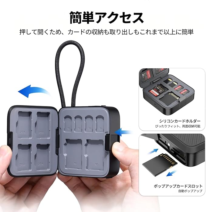 【耐久性と耐熱性に優れ、持ち運びに便利なストラップデザイン】全アルミニウム合金シェルと効率的な熱放散により、安全で中断のない伝送を保証します。2-in-1 充電ケーブルとストラップは耐久性と柔軟性があり、外出先でも便利に使えます。また、押して開くので、カードの収納と取り出しが今まで以上に楽になります。