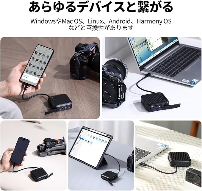 特徴 3枚同時読み込み、大容量コンパクト、高速データ伝送、アルミニウムシェル、ストラップデザイン