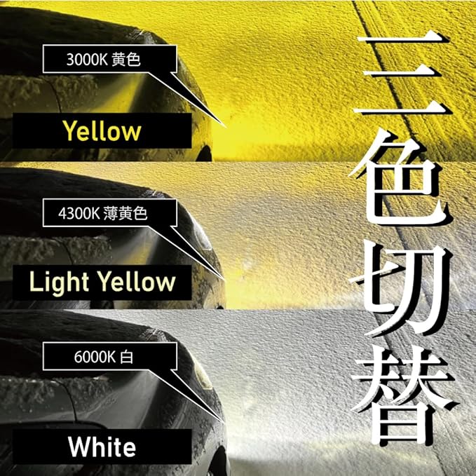 H8/H11/H16/H9のLEDフォグランプ 電源のON/OFFをすることで、3色を切替えて使用できます。 色温度は3000K(黄色)/4300K(薄黄色)/6000K(白)、 3色爆光。 ■■ 商品内容 ■■ LEDバルブ 2本 取扱説明書(日本語)