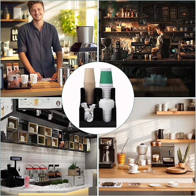 【容量】4つのコンパートメントがあり、使い捨て 紙コップ、紙コップ スリーブ、コップ 蓋、コーヒーカップ、お茶などを収納できます